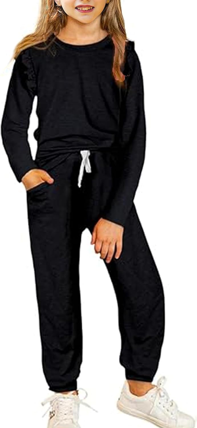 - 🌈Stylish design>> Girls’clothing sets come with tops and pants. Long Sleeve Shirts is super cute with the classic round neck and added shoulder ruffle which is a nice touch and makes the top even more classy and adorable. The pants feature an elastic waistband, easily put on/off. Two side pockets for storing treasures that are found outside playing, hiking, and exploring.